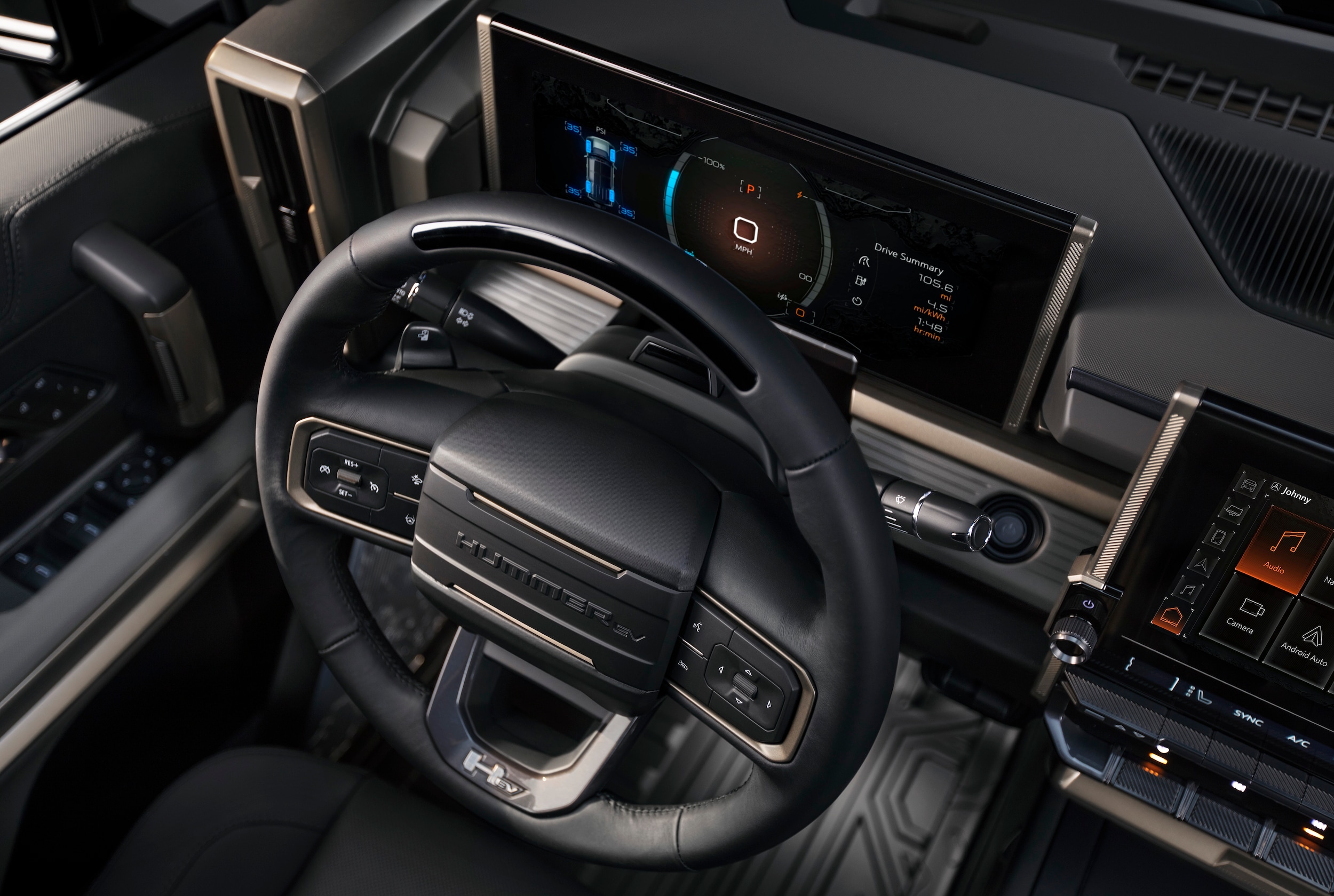 Inside the spacious cabin, you'll find seating for up to 5 with a 60/40 split folding rear bench seat. The GMC HUMMER EV offers a premium experience with leather-alternative seating surfaces, a 12-way power driver seat, tri-zone climate control, and a 14-speaker Bose premium audio system. An expansive 13.4-inch infotainment screen with Google built-in and wireless Apple CarPlay/Android Auto keeps you connected wherever your adventures take you.