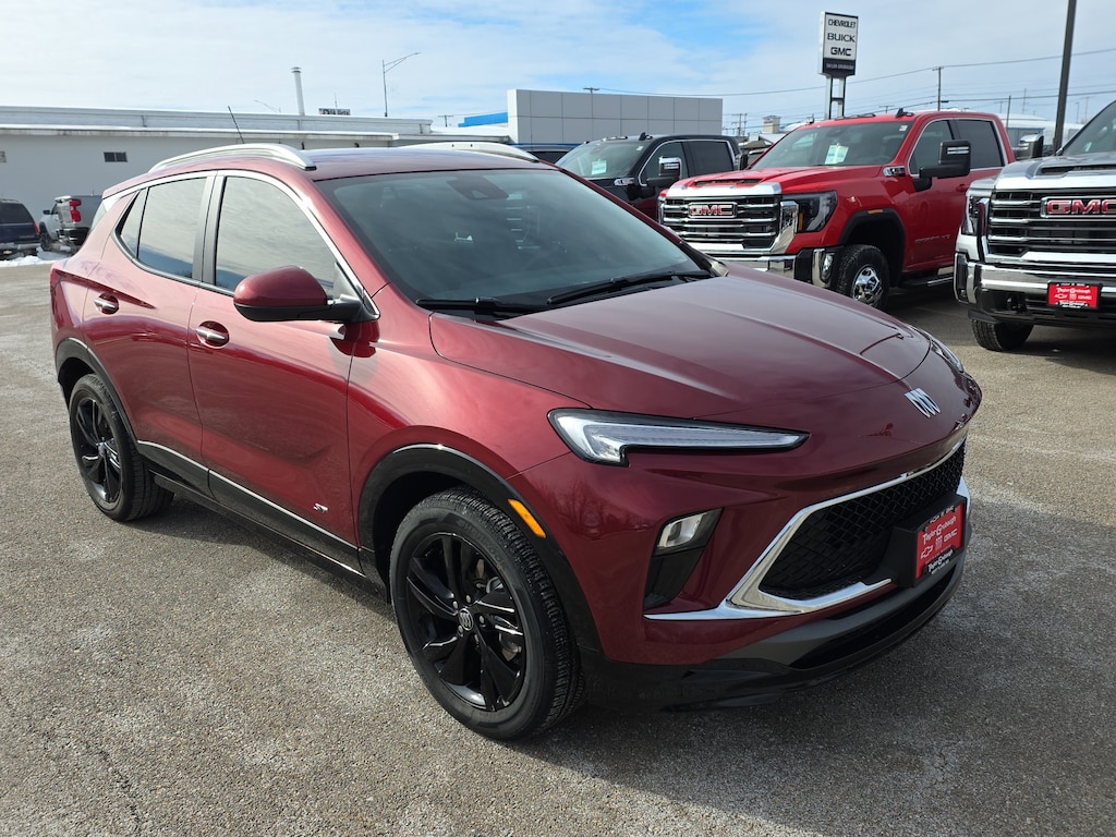 Leather, Remote Start, Bluetooth, Rear Camera, Intelink Radio, Low Miles, One Owner, Local Trade, No Accident, Apple CarPlay, Android Auto, Encore GX Sport Touring, GM Certified, 4D Sport Utility, ECOTEC 1.3L Turbo, CVT, FWD, Cinnabar Metallic, Ebony Seats Interior With Santorini Blue Stitching Artificial Leather, 2 USB Ports (1 Type-A, 1 Type-C), 2-Way Power Driver Lumbar Control, 4-Way Manual Passenger Seat Adjuster, 4-Wheel Disc Brakes, 5.45 Final Drive Axle Ratio, 6 Speakers, 6-Way Manual Driver Seat Adjuster, 8-Way Power Driver Seat Adjuster, ABS brakes, Air Conditioning, Alloy wheels, AM/FM radio: SiriusXM, Auto High-beam Headlights, Automatic temperature control, Brake assist, Bumpers: body-color, Comfort Package, Compass, Delay-off headlights, Driver door bin, Driver vanity mirror, Dual front impact airbags, Dual front side impact airbags, Electronic Stability Control, Emergency communication system: OnStar and Buick connected services capable, Enhanced Performance 6-Speaker System, Flat-Folding Front Passenger Seatback, Front anti-roll bar, Front Bucket Seats, Front Center Armrest, Front License Plate Bracket, Front reading lights, Front wheel independent suspension, Fully automatic headlights, Heated door mirrors, Heated Driver & Front Passenger Seats, Heated Steering Wheel, Illuminated entry, Knee airbag, Leatherette Seat Trim, Low tire pressure warning, Occupant sensing airbag, Outside temperature display, Overhead airbag, Overhead console, Panic alarm, Passenger door bin, Passenger vanity mirror, Power door mirrors, Power steering, Power windows, Preferred Equipment Group 1SD, Radio data system, Radio: Audio System w/AM/FM, Rear Center Armrest, Rear reading lights, Rear side impact airbag, Rear window defroster, Rear window wiper, Remote keyless entry, Ride & Handling Suspension, Security system, SiriusXM Trial Subscription, Speed control, Speed-sensing steering, Split folding rear seat, Spoiler, Sport steering wheel, Steering wheel mounted audio controls, Tachometer, Telescoping steering wheel, Tilt steering wheel, Traction control, Trip computer, Variably intermittent wipers, Wheels: 18 Gloss Black Aluminum, Wireless Apple CarPlay/Wireless Android Auto, Encore GX Sport Touring, 4D Sport Utility, ECOTEC 1.3L Turbo, CVT, FWD, Cinnabar Metallic, Ebony Seats Interior With Santorini Blue Stitching Artificial Leather. Certified. Cinnabar Metallic 2025 Buick Encore GX Sport Touring ECOTEC 1.3L Turbo CVT FWD 4D Sport Utility